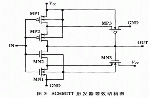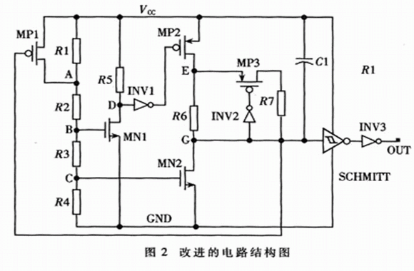 改進的電路如圖2所示,電路結構由采樣、先導控制、比較器、遲滯反饋回路、加速響應電路、緩沖器六部分構成。電阻R1、R2、R3、R4構成分壓電阻網(wǎng)絡實現(xiàn)對Vcc的采樣;MNl、R5、INVl組成先導控制電路,實現(xiàn)對比較器灌電流的控制;MN2、R6、MP2組成比較器,實現(xiàn)采樣電壓與MN2的VTH比較;MP1構成正反饋回路,可實現(xiàn)Vcc的遲滯功能;INV2、MP3、R7構成正反饋回路,可加速比較器的翻轉,從而提高電路的響應速度;SCHMITT觸發(fā)器和INV3是緩沖電路,對比較器的輸出波形進行緩沖和整形,SCHMITT觸發(fā)器的結構如圖3所示,其工作原理詳見參考文獻[3];另外,電容C1起濾波和儲能作用。