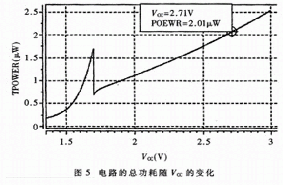 從圖5的仿真波形中可以看出:當Vcc的電壓正常時,電路的總功耗隨著Vcc的升高而增大,當Vcc=2.7V時,總功耗約為2μW,可見電路的靜態(tài)功耗很低。