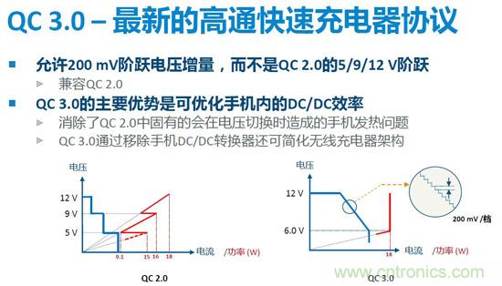 從事電源設(shè)計(jì)開發(fā)和技術(shù)支持工作超過24年的Jason分析道,從線型降壓電源開始,電源開發(fā)在摸索中前進(jìn),體積越做越小,充電方式也迎來了新的變革,現(xiàn)在的趨勢是快速充電。以前的充電器只提供一個固定的輸出電壓(5V),電源提供的輸出功率取決于輸出電流的大小,輸出電流越大則提供給電池端的功率更大,從而提高充電效率減小充電時間。但電流不能無限制的增加,因在輸出電纜的功耗隨電流的增大會相應(yīng)的增加。因而快速充電應(yīng)用應(yīng)運(yùn)而生。其實(shí)現(xiàn)方法是手機(jī)跟充電器進(jìn)行雙向通訊,電源會根據(jù)負(fù)載端發(fā)出的指令做出反應(yīng),改變其輸出電壓和電流,實(shí)現(xiàn)減小功率損耗、增大充電功率、減小充電時間的目的,從而實(shí)現(xiàn)快速充電。
