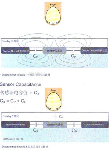 那么,電容式感應(yīng)的工作原埋是什么呢?下面的示意圖顯示了1個(gè)電容式感應(yīng)按鈕的橫截面。如圖所示,在外覆層材料之下,存在導(dǎo)電的銅塊區(qū)域和導(dǎo)電的傳感器。在2個(gè)導(dǎo)電元件相互之間靠得很近時(shí),就會(huì)產(chǎn)生一個(gè)電容值,本圖中標(biāo)為Cp,這個(gè)電容值是由于傳感器墊板與接地板之間的耦合現(xiàn)象而形成的。Cp屬于寄生電容,典型數(shù)量級(jí)任10pF至300pF。傳感器與接地板靠近時(shí)也會(huì)形成一個(gè)邊緣電場,這個(gè)電場能夠穿透外覆層?;旧希梭w組織也屬于導(dǎo)電體。將一根手指放存邊緣電場附近時(shí),就會(huì)增加這個(gè)電容系統(tǒng)的導(dǎo)電表面面積。